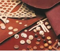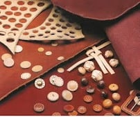 Leather is tanned animal skin, which is made durable by chemicals. The natural fibre structure is largely preserved during this process. It is a supple, tough, relatively strong, durable and versatile material. It is relatively impermeable to water, yet it is breathable, that is sufficiently permeable to air and water vapour. Leather is among the oldest materials used by mankind, together with wood, stone and wool. In addition to footwear and leather garments, many other belongings are brought in connection with leather. In the production of a leather buttons, there are two types of buttons. The braided leather knob is made by pressing hand-braided leather straps together and attaching a metal or leather shank at the backside. For a multi-piece assembled leather button, several parts made of leather and plastic or metal are put together. A genuine leather button can be recognized by its soft material, as well as its characterized smell. Leather buttons are very durable, but should not be washed because tanning agents could ooze and cause discolouration of the fabric. Leather buttons belong to the upper price range and are valued due to their natural appearance. They are used mainly for high-quality women’s and men’s clothing.