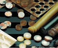 The processing of duroplast raw material is carried out through machining or moulding processes. In the machining process, plastics made from polyester or casein are used, which are delivered in the form of rods or plates. Blanks are first created and then further processed by milling, drilling, sawing, or turning. Duroplasts can be produced in a wide range of shapes and colours, allowing for buttons that mimic natural materials like mother of pearl and horn. Special effects can be achieved by using multi-coloured layers of material. These buttons fall into the medium price range and are used across various sectors of the clothing industry.